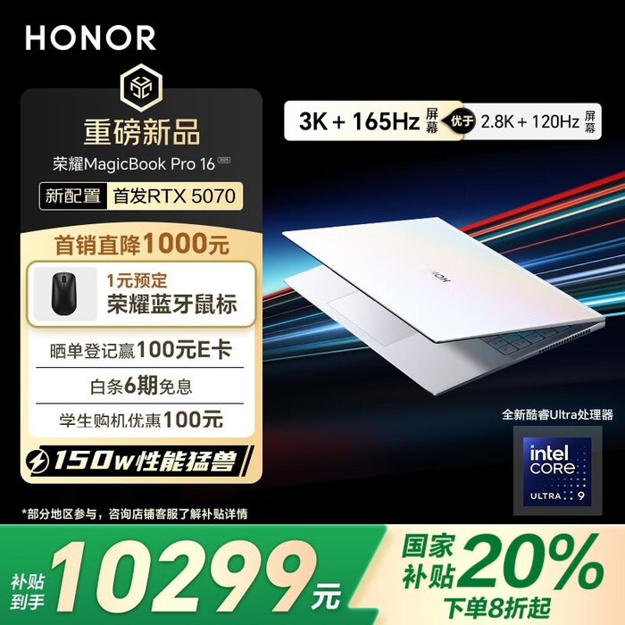 荣耀HONOR MagicBook Pro16 2025京东优惠价10299元