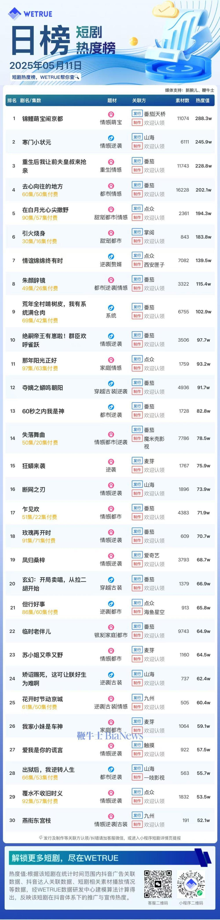 1、本日榜为WETRUE短剧数据公司提供,新腕儿和鞭牛士提供联合支持。