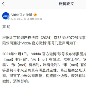 2021 年 11 月 1 日,“Vidda 官方微博”账号发布海报图片,现法院判定图片中“米【mei】有问题”、“米【mei】有屌丝,唯有上帝”、“米【mei】有耍猴,唯有彪霸”、“米【mei】有暴利,唯有让利”、“米【mei】有伪性价比,唯有六边形战士”等语句与小米公司具有明显对应性,易让相关公众认为其中的“米”系指向小米公司,损害了小米公司声誉,构成商业诋毁。聚好看科技股份有限公司特发布本条微博,消除影响。