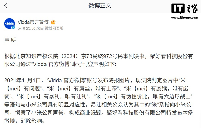 根据北京知识产权法院(2024)京 73 民终 972 号民事判决书,聚好看科技股份有限公司通过“Vidda 官方微博”账号刊登声明如下: