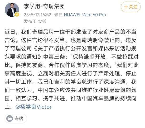 对于该网传消息,吉利控股集团高级副总裁杨学良表示,“已就个别员工言论引发的争议与奇瑞高层沟通,奇瑞展现出了诚信负责的风范,此事已得到妥善处理,告一段落。我们团结一致向前看,共同推动中国汽车品牌做大做强,走向世界! ”