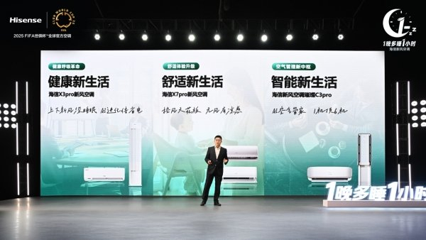 发布会上,海信空调副总工程师李本卫携2025海信新风家族三款战略新品亮相。其中,主打“增氧轻音深睡眠”的海信新风空调X3pro、“AI空气管家 1机顶6机”的海信新风空调璀璨C3pro还是2025FIFA世俱杯官方指定空调,而主打母亲人群关怀的海信新风空调X7Pro更是上市就成为妈妈人群的首选。
