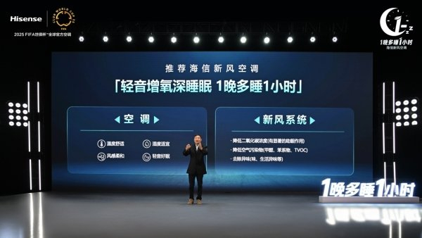5月12日,在“1晚多睡1小时—海信新风生活方式发布会”上,海信正式推出新风空调健康睡眠解决方案,并联合中国睡眠研究会、中国家用电器研究院等多家权威机构正式发布《新风空调助眠白皮书》,白皮书以科学严谨的实验证明:海信新风空调凭借其新风增氧、高效净化以及极致静音的独特属性,能显著改善睡眠环境的空气质量,提升睡眠的舒适度,全方位实现睡眠效率的提升。在海信新风空调优化后的空气环境中,用户7小时的睡眠时长,可抵传统空调环境下8小时的睡眠效果,相当于 “1晚多睡1小时”。