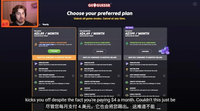 他在视频里一改原本几乎不怎么批评官方的温和形象,开始清算《GeoGuessr》收费问题:就算是在网页版游戏里,也依然存在极不合理的收费档位,每15分钟只能玩5分钟的“基础Pro档”会员。