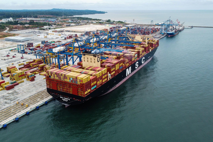 由中国港湾工程有限责任公司承建的喀麦隆克里比深水港二期项目近日投入运营,图为货轮停靠在喀麦隆克里比深水港二期码头(无人机照片)。