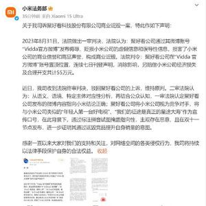 此前,海信集团旗下子品牌Vidda官方发布声明称:2021年11月1日,“Vidda 官方微博”账号发布海报图片,现法院判定图片中“米【mei】有问题”、“米【mei】有屌丝,唯有上帝”、“米【mei】有耍猴,唯有彪霸”、“米【mei】有暴利,唯有让利”、“米【mei】有伪性价比,唯有六边形战士”等语句与小米公司具有明显对应性,易让相关公众认为其中的“米”系指向小米公司,损害了小米公司声誉,构成商业诋毁。聚好看科技股份有限公司特发布本条微博,消除影响。