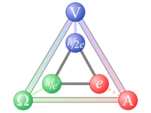 虽然理论理解仍在发展中,但 QMT 将欧姆定律的基础牢固地建立在量子电常数之上。该三角形基于电压的约瑟夫森效应、电阻的量子霍尔效应和电流的单电子隧穿。它包含电子电荷 (e) 和普朗克常数 (h) 等基本常数(图 2)。