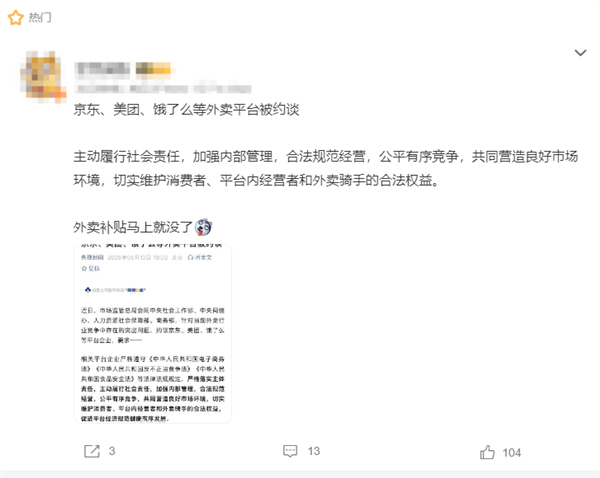 快科技5月13日消息,五部门联合约谈京东、美团、饿了么等外卖平台,剑指行业乱象促健康发展。