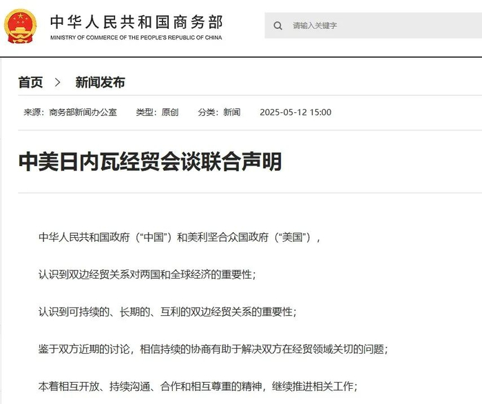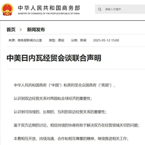 5月12日,中国与美国发布《中美日内瓦经贸会谈联合声明》,双方承诺将于2025年5月14日前采取以下举措:
