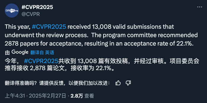 全球性的顶级学术会议,从来都是领域内的「风向标」。CVPR 全称为计算机视觉与模式识别会议,是计算机视觉领域中最重要的国际会议之一。今年的 CVPR 2025 共收到 13008 份论文投稿,最终接收 2878 篇论文,整体接收率为 22.1%。
