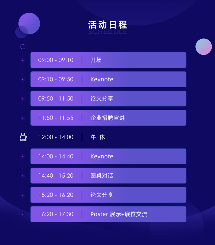 本次论文分享会将设置 Keynote、论文分享、圆桌对话、企业招聘宣讲、论文 Poster 展示、企业展位交流环节,就业内关注的多模态、视频生成等热门主题邀请顶级专家、论文作者与观众做学术交流。