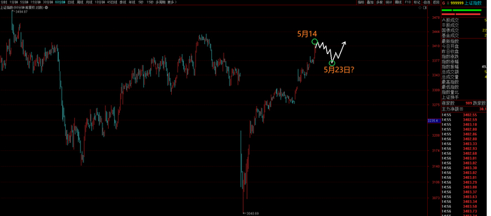 “今天5月14日,是上周预测的三大指数短线高点时间,下午还有潜力继续冲高,最迟明天逐渐回落、整固。而中小微盘股为主成分大盘指数,高点在5月16日,所以今天整固后,逐渐进一步冲高直至五月16日。”