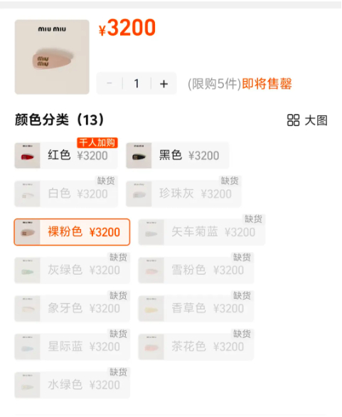 以售价3200元的Miu Miu发夹为例,Miu Miu天猫官方旗舰店客服告诉《贵圈》栏目,“这款发夹主要材质是皮质的,采用漆皮工艺,目前只有红色、黑色和裸粉色还有现货库存,其他颜色都暂时售罄了。”