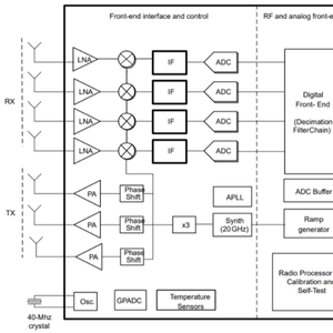 查看图 1 中德州仪器 IWR6843 的方框图可以发现,发送器-接收器部分的唯一外部元件是标准 40MHz 晶体。除了这个外部 40MHz 晶体之外,IWR6843 还提供完全的发送器/接收器集成,具有: