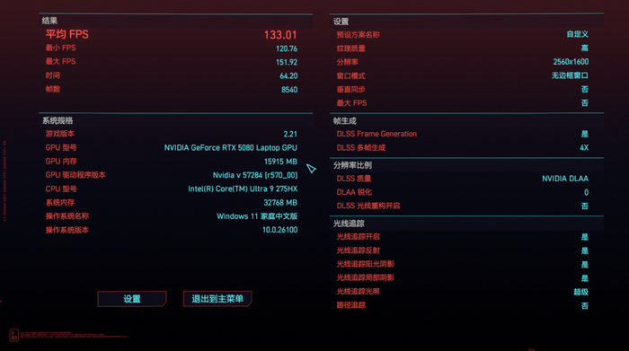 最后是对性能要求更高的《赛博朋克:2077》,当然也可以更充分地展现 RTX 5080 的游戏性能。首先是在 2.5K 分辨率搭配超级画质选项,运行游戏自带的基准测试,可以看到平均帧数能达到 95 fps,实际游玩起来已经会很流畅了。
