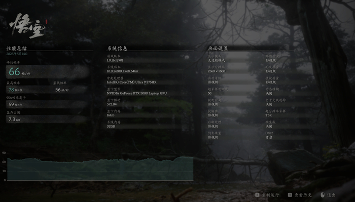 接下来是对性能要求更高的《黑神话:悟空》,2K 分辨率加影视级画质,50% 超采样加 TSR,关闭光线追踪的情况下,没有 DLSS 帧生成功能的帮助,游戏平均帧数能达到 66 fps,已经基本能达到畅玩的水平了。