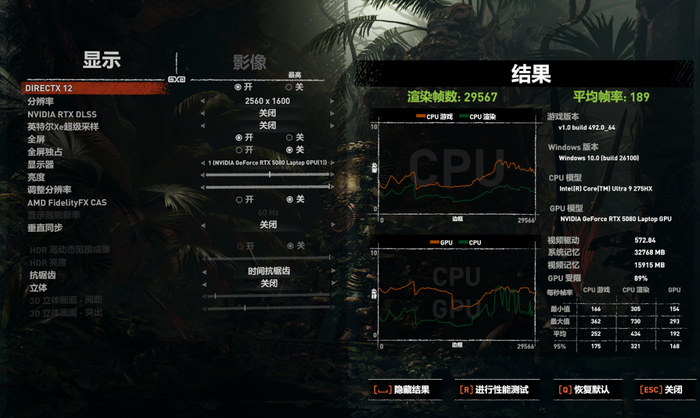 随后是《古墓丽影:暗影》,使用游戏自带的基准测试,在 2.5K 最高画质下得到 189 fps 的平均帧率,1% Low 帧为 154 帧,可谓又丝滑又稳。