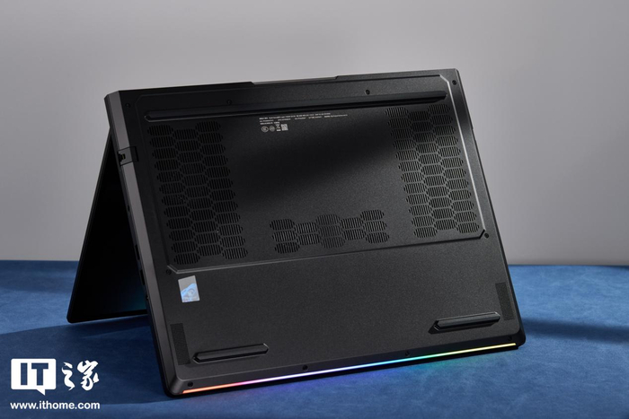 而在笔记本的转轴部分,则能看到扬声器开孔以及大体积的散热出风口,有着硬朗线条的装甲式设计,同时还有线条式的 RGB 灯效,其与 A 面醒目的 Y 字形发光 Logo 、键盘的背光灯效,共同构成 413 颗灯珠组成全新的氛围灯效系统,可通过屏光同步、声光同步等实现视觉、听觉与光效的三维交互,构建沉浸式电竞环境。