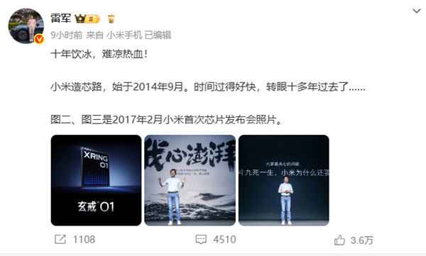 今早,雷军微博发文感慨:“十年饮冰,难凉热血!小米造芯路,始于2014年9月,时间过得好快,转眼十多年过去了。”