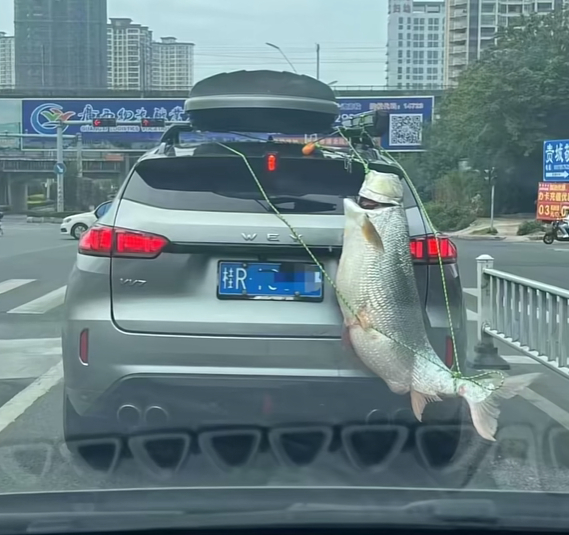不少当地网友表示在街头偶遇了这辆车,从网络上曝光的图片看,这条鱼确实不小,被绑在一辆VV7车尾右侧,好在没有遮挡号牌。