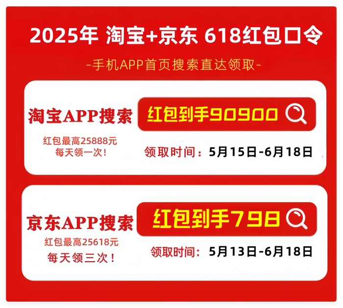首先,划重点!2025年最新的京东618红包口令是「红包到手798」,天猫/淘宝618红包口令是「红包到手90900」记得每天去领,领的红包大小和你搜索的什么口令有关的!