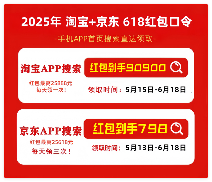 首先,划重点!2025年最新的京东618红包口令是「红包到手798」,天猫/淘宝618红包口令是「红包到手90900」记得每天去领,领的红包大小和你搜索的什么口令有关的!