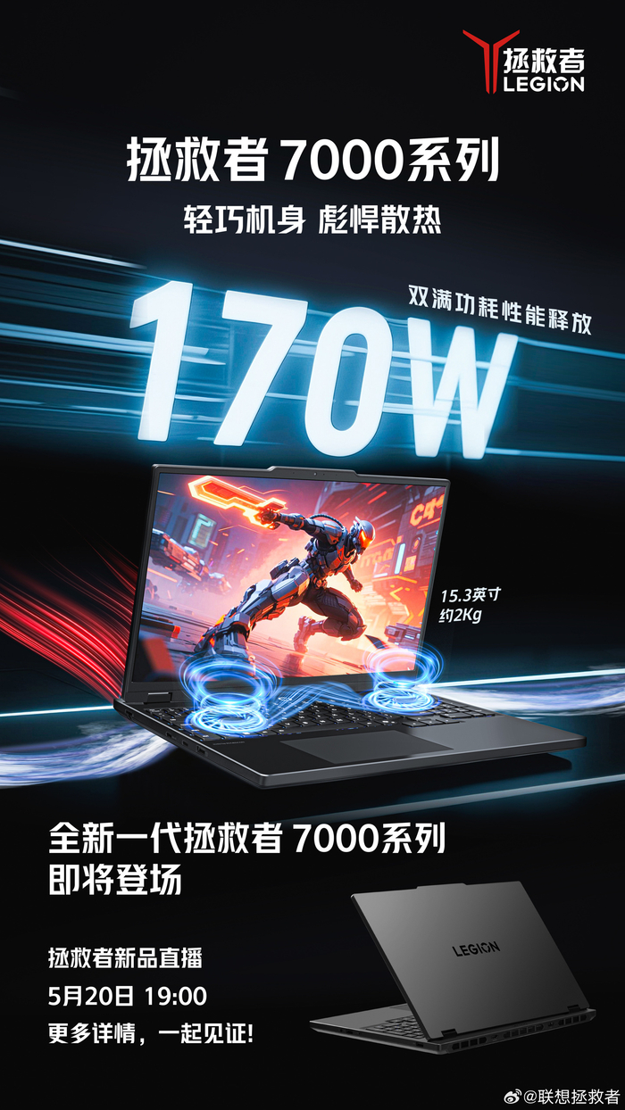 IT之家 5 月 18 日消息,联想 15.3 英寸的拯救者 7000 系列新品将于 5 月 20 日揭晓。