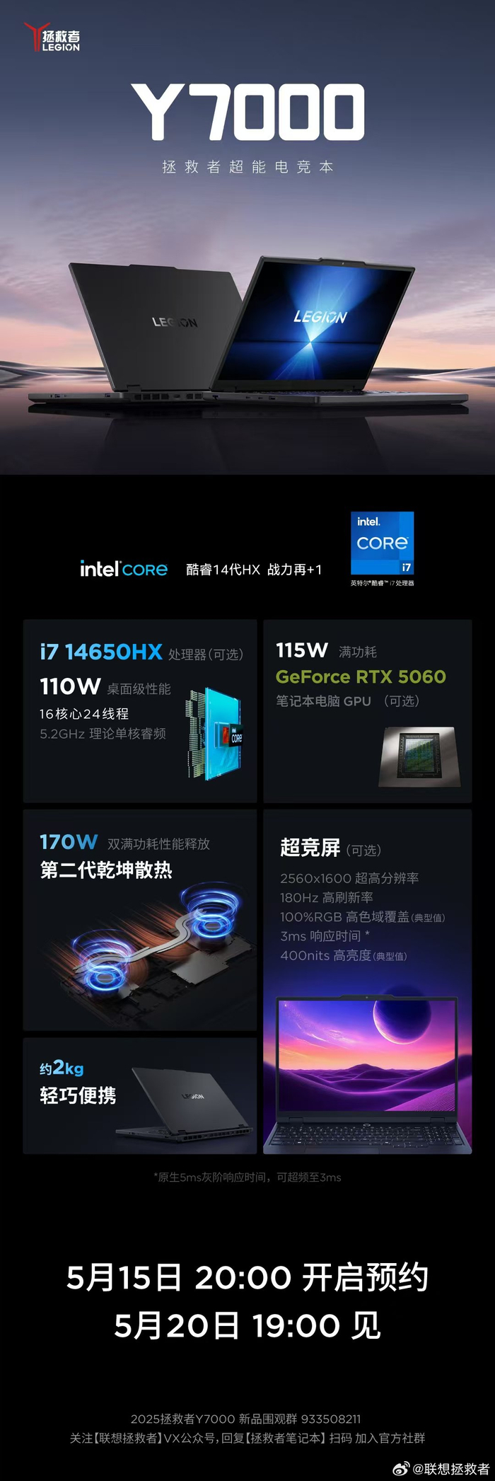联想拯救者 Y7000 2025 新品预热:重约 2Kg,双烤性能释放 170W