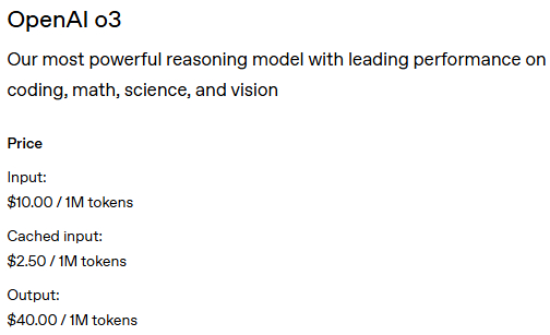 价格还不低,拿 OpenAI 的 o3 举例,每百万个字符输入要收 10 刀,缓存中间结果要 2.5 刀,输出要 40 刀。
