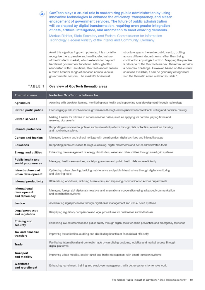 真正的GovTech转型将带来深远的好处,从更有效的资源分配和数据驱动的决策,到在公共服务领域创造新的价值。通过简化流程和改善问责制,政府可以提供更快、更有响应力的服务,以满足民众的需求。除了对治理产生直接影响外,GovTech还将刺激各行业的创新、创造就业机会和全球经济增长。从这个意义上说,GovTech不仅仅是政府现代化的工具;它成为推动全球进步的强大引擎。
