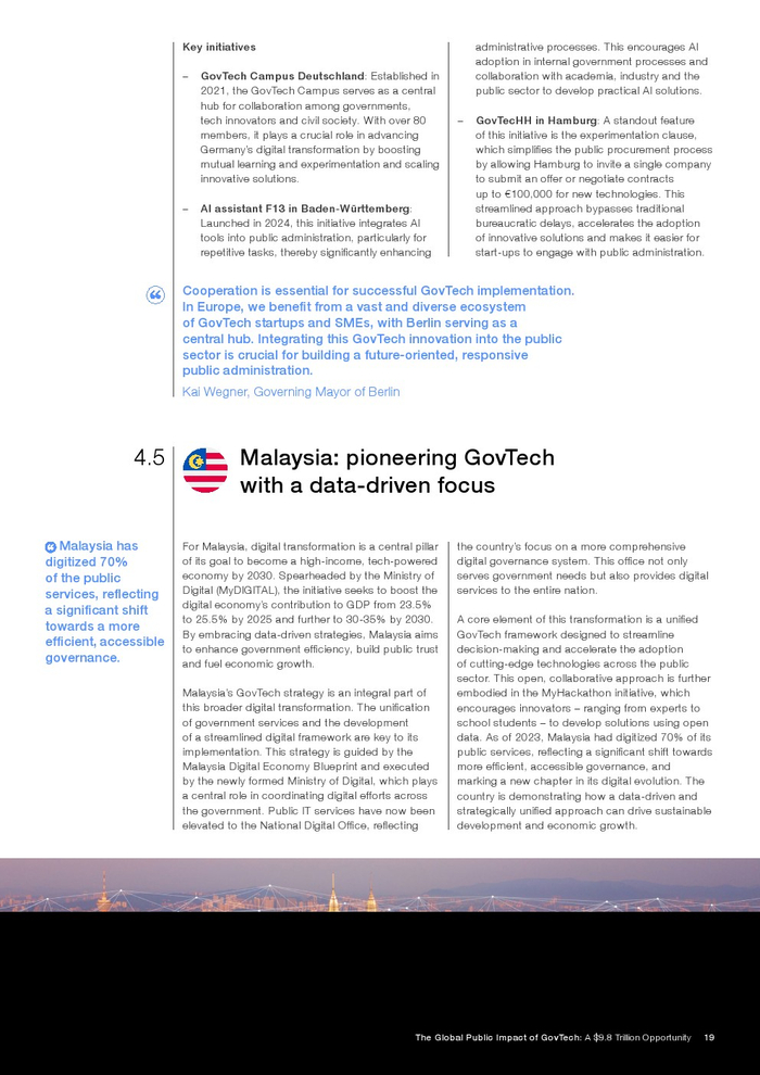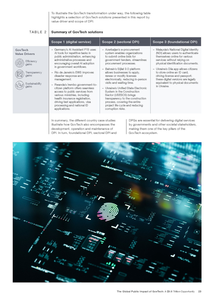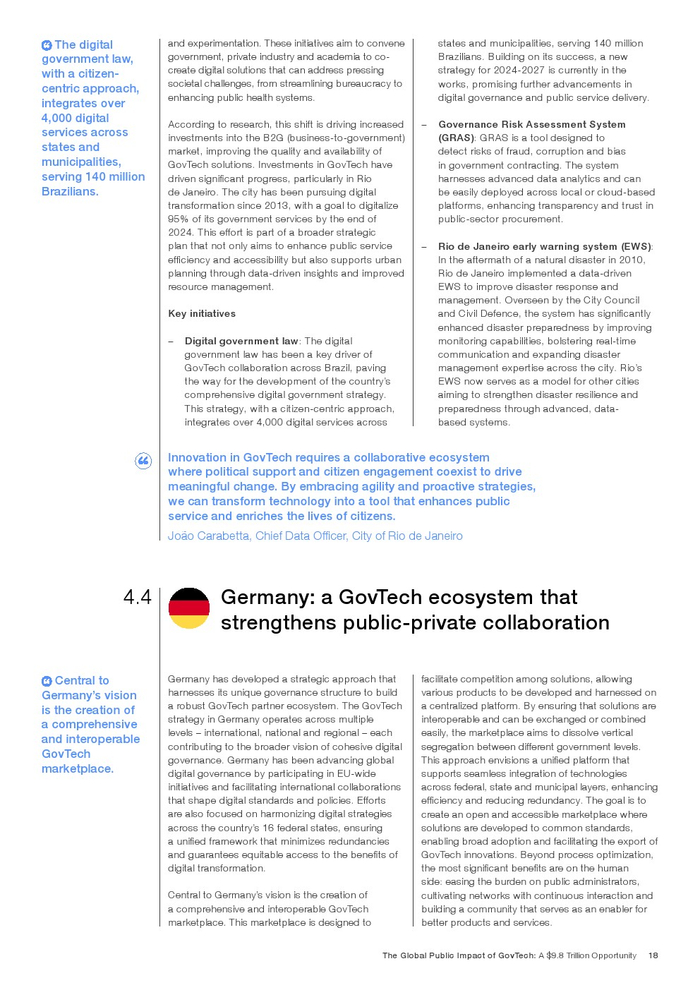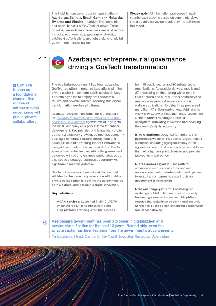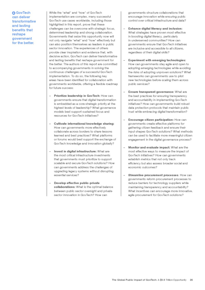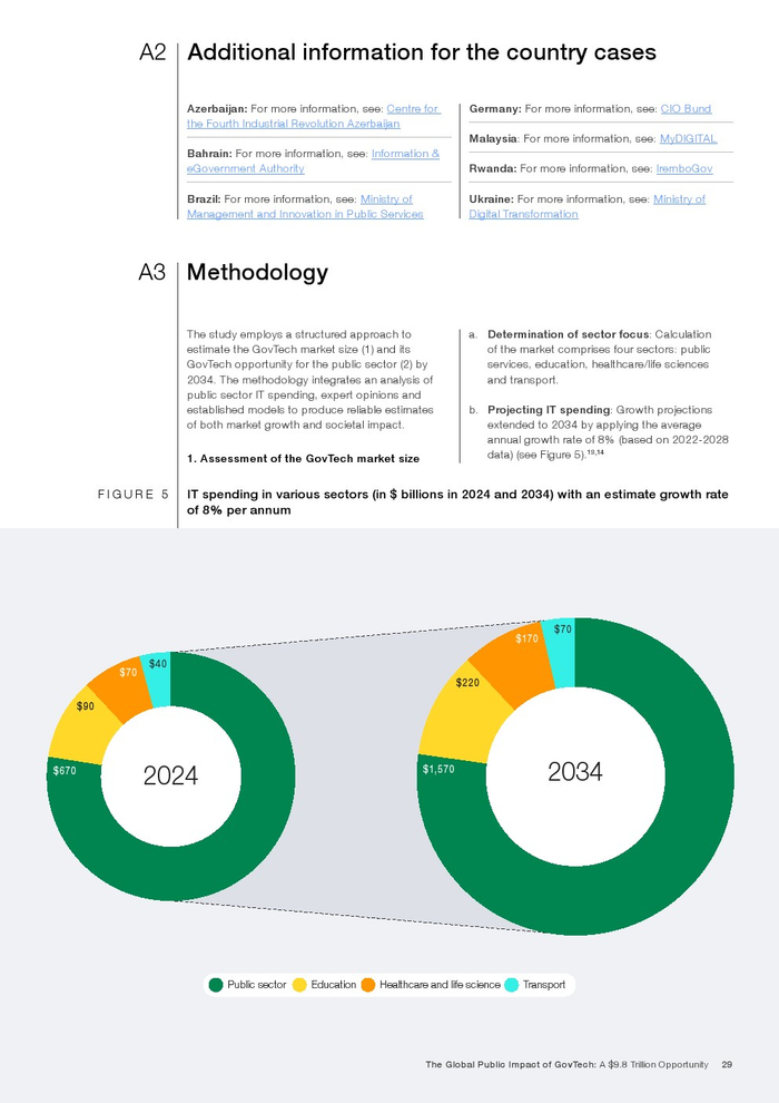 实现政府科技的潜力需要根据每个国家的地区、宪法和政治环境采取战略性和果断的行动。报告探讨了阿塞拜疆、巴林、巴西、德国、马来西亚、卢旺达和乌克兰如何实现公共部门现代化。在这些研究中,一个主题浮现出来:为了全面实现政府科技,政府必须建立强大的信息技术基础设施,面向未来的公共服务,促进更紧密的公私合作,并高度重视以公民为中心的解决方案。这种方法不仅仅是数字化流程,而是重新思考政府如何更好地为人民服务。