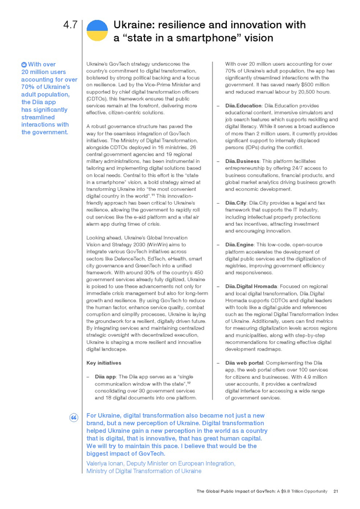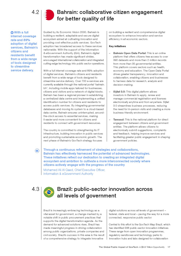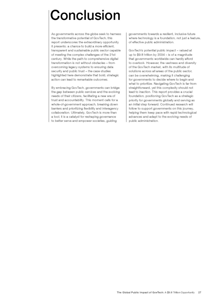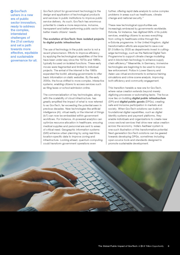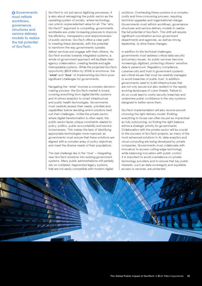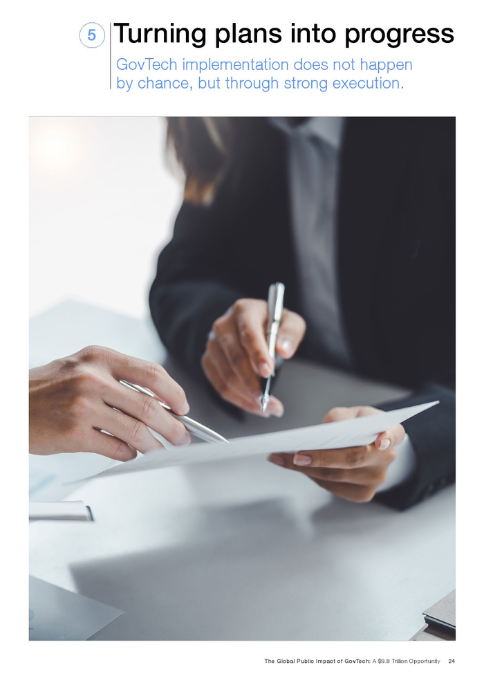 实现政府科技的潜力需要根据每个国家的地区、宪法和政治环境采取战略性和果断的行动。报告探讨了阿塞拜疆、巴林、巴西、德国、马来西亚、卢旺达和乌克兰如何实现公共部门现代化。在这些研究中,一个主题浮现出来:为了全面实现政府科技,政府必须建立强大的信息技术基础设施,面向未来的公共服务,促进更紧密的公私合作,并高度重视以公民为中心的解决方案。这种方法不仅仅是数字化流程,而是重新思考政府如何更好地为人民服务。