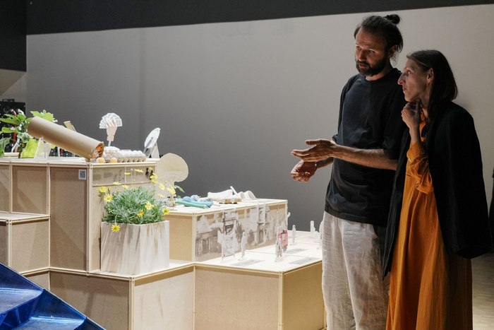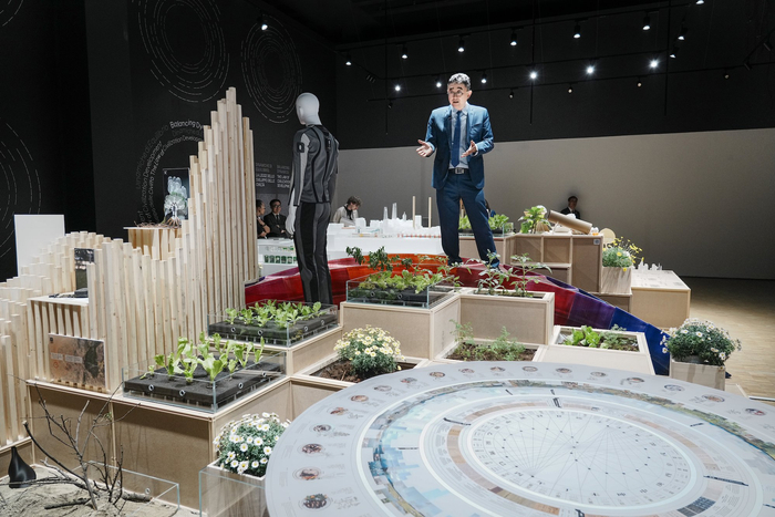 展区内,由娄永琪教授设计、采用开源软硬件控制的鱼菜共生系统“超级活态装置”,以安吉尔净水专利作为底层技术支撑,与各主题展区的展品陈列形成联动,实现整体意象和多元表达的统一。该水系统装置以《论衡・变动》中“平和相反,而生变化”的东方哲学为根基,通过建筑、科技、艺术的跨维度对话,诠释“在失衡中创造平衡,于动态中实现发展”的文明逻辑。