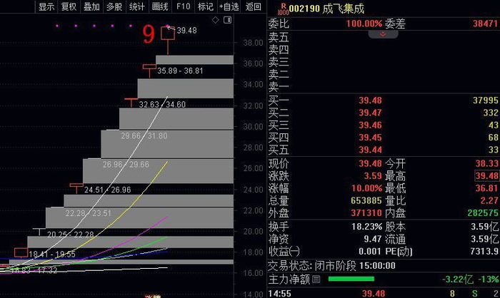 成飞连续9个涨停后,军工板块老2时利君股份,老2跟风的容易见顶部,它估计是第二波顶部的概率大。。军工打出来了赚钱效应,连续9个涨停,代表后面的新热点题材涨停高度也会慢慢打开,甚至接力卡位。所以后面关注新热点题材的第一波机会