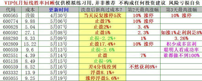 周末这里总结了数据,优化改善了部分细节,可以提高上涨率,比如今早VIP潜伏的2个就是1只涨停,1个收盘浮盈8%,而且针对这类第一波连续涨停启动的品种,也做出了优化,未来出现新的热点时如果进入后次日涨停的记住合适格局,除非下午打开跌破分时黄色线没有封住,比如5月14号止盈做过的红墙股份就是下午涨停打开跌破分时黄色线的,自然合适落袋为安积少成多,如能早上涨停到收盘的代表游资抱团在做,那么走掉又怕继续涨停的要学会分2批即可