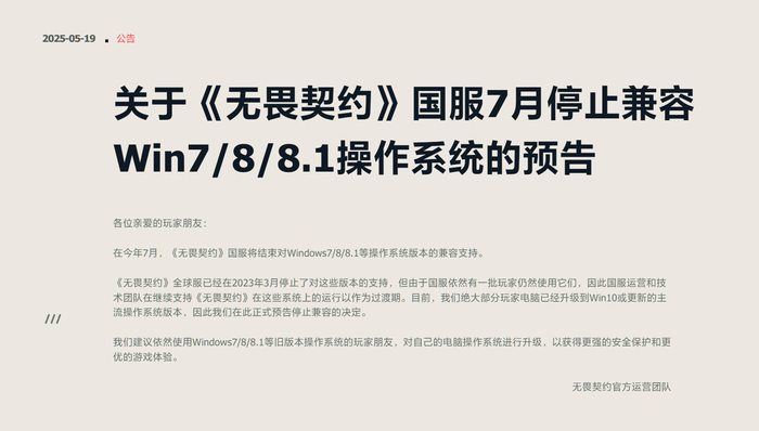 IT之家从官方公告获悉,目前绝大部分玩家电脑已经升级到 Win10 或更新的主流操作系统版本,因此正式预告停止兼容的决定。团队建议依然使用 Windows7/8/8.1 等旧版本操作系统的玩家朋友,对自己的电脑操作系统进行升级,以获得更强的安全保护和更优的游戏体验。