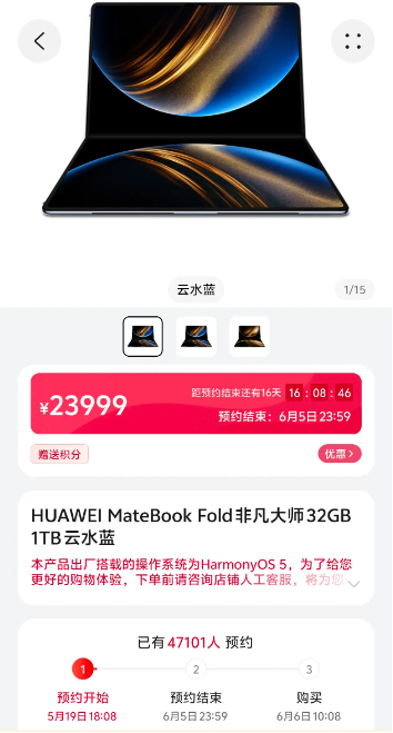 备受关注的要数鸿蒙折叠电脑,虽然售价高达23999元-26999元,但华为用户们的热情不减,截至5月20日8点,即预约开始14个小时,华为商城中华为MateBook Fold非凡大师的预约人数就超过了4.7万人。