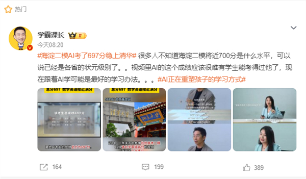 他还称:“AI的这个成绩应该很难有学生能考得过他了,现在跟着AI学可能是最好的学习办法。”