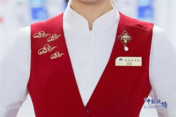 中国结造型的精美胸针,寓意吉祥和美好,代表着铁路工作人员对旅客的美好祝愿。