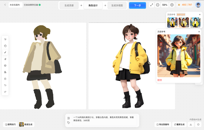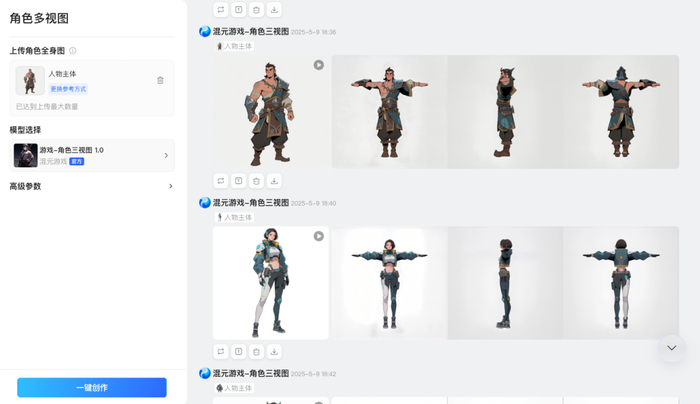 无论是绘制角色概念草图、多视角效果图还是根据文字内容调整美术素材,“混元游戏”的另一大优势在于能够无缝集成多个AI工具,无需跳转即可在一个页面完成“获取灵感-绘制角色概念草图-生成标准角色多视图”的整个工作流程,减少了多工具间反复切换可能造成的失误。