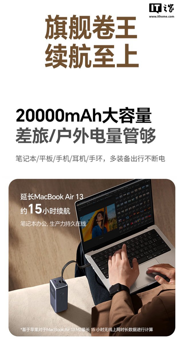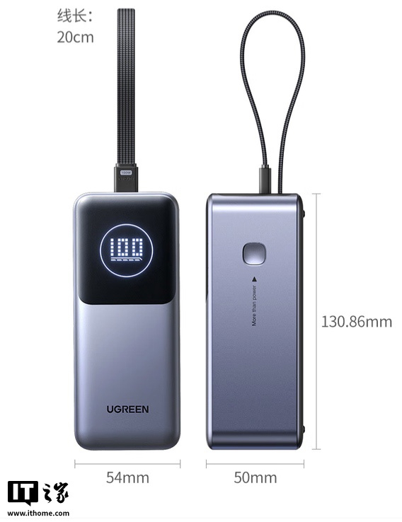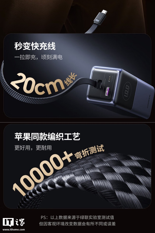 根据绿联官方所述,该充电宝自带的线缆采用编织工艺,长度为 20cm;单口最大输出可达 100W,可充 macOS、Windows 平台的笔记本电脑,同时双口最大功率输出可达 130W,可在充 MacBook 的同时为 iPad Pro 充电。