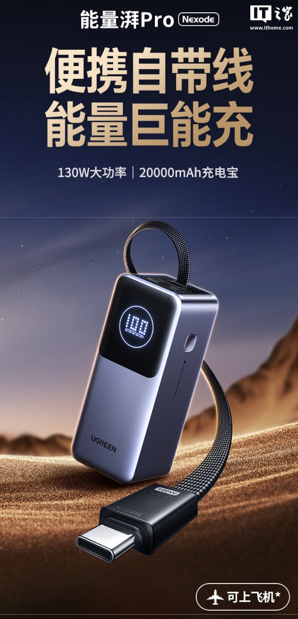IT之家 5 月 20 日消息,绿联能量湃 Pro 充电宝现已上市,该充电宝容量为 20000mAh,总输出功率可达 130W,采用自带线设计,券后售价 189 元。