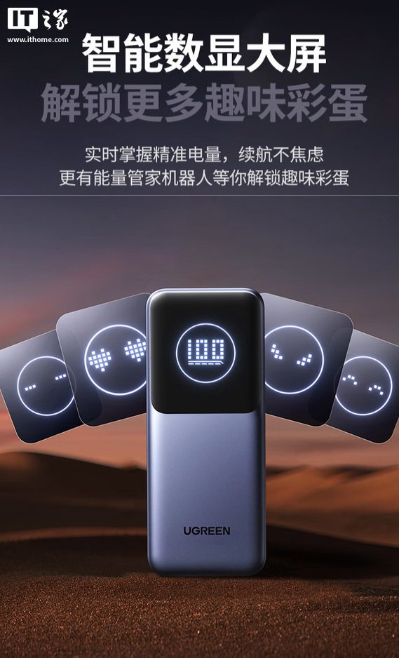 该充电宝的最大输入功率为 80W,根据绿联官方数据,可在 2 小时内充满,在充电协议方面,支持 UFCS、PD、PPS、QC、SCP 和 AFC 等;此外,该充电宝正面还有一块数显屏幕,除了显示电量之外,还可化身“能量管家机器人”,增添一份乐趣。