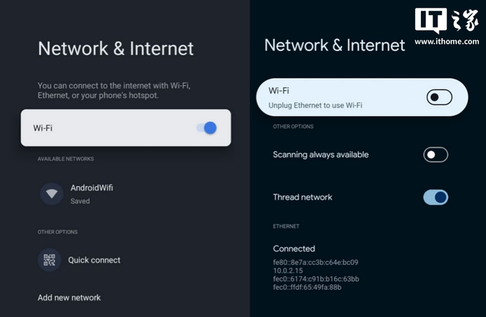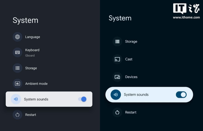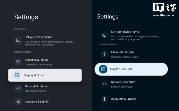 全新设置菜单虽然不像手机更新那样色彩丰富,但新界面焕发出新的活力,每个分区标题以圆角矩形突出显示,图标从之前的浅色设计改为深色圆圈,开关按钮也采用了安卓 16 手机上的全新样式,彻底告别 Android TV OS 14 的过时设计。IT之家附上对比图如下: