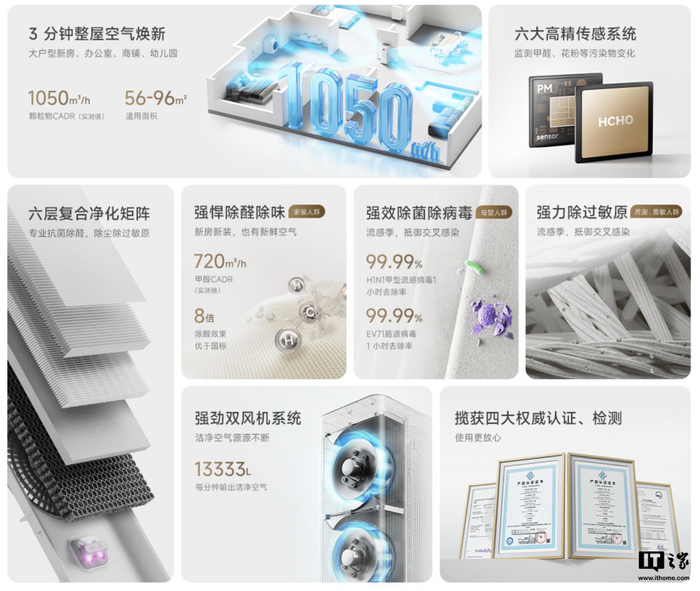IT之家获悉,该空气净化器配备双风机系统,其每分钟可输出 13333L 洁净空气,实现“3 分钟空气焕新”,同时配有甲醛传感器,号称可以强力除醛分子滤层、专效除醛配方炭层,号称获得四大专业机构认定。