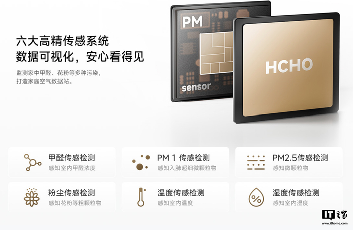 此外,该空气净化器号称搭载灭菌矩阵,采用“抗菌涂层+紫外线 UVC 杀菌”,配有纳米级高精滤材,还能监测 PM1、PM 2.5、粉尘、温度、湿度等信息。