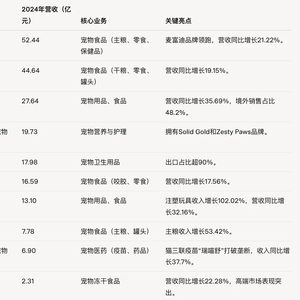 通过对乖宝宠物、中宠股份2024年的整体业绩观察可以发现,其业绩增长大部分来源于宠物主粮业务的增长。例如,2024年乖宝宠物主粮业务营收约达27亿元,同比增长28.88%;中宠股份主粮业务营收约达11.07亿元,同比大幅增长91.85%。
