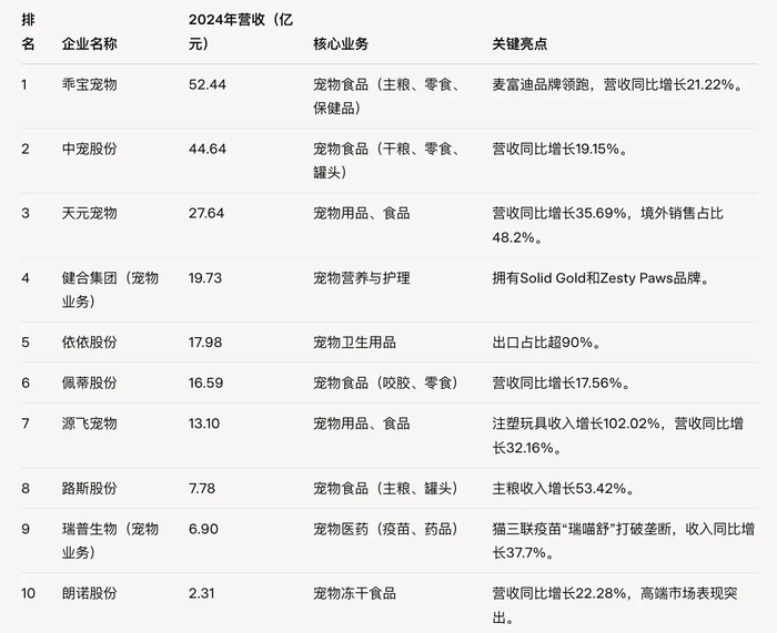 排名第三的天元宠物2024年公司营收达27.64亿元,同比增长35.69%,成为本年度增速最快的上市宠企之一。