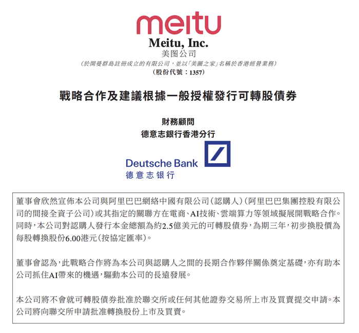 5月20日晚,美图公告宣布,与阿里签署2.5亿美元(约合人民币18亿元)可转债协议,双方将在电商平台、AI技术、云计算等领域展开战略合作。