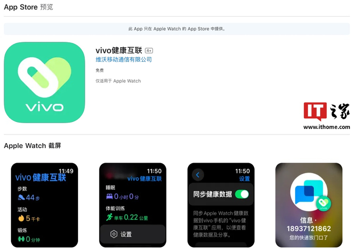 IT之家 5 月 21 日消息,由维沃移动通信有限公司(vivo)开发的“vivo 健康互联”App 现已上线苹果 Apple Watch 端,支持用户通过该 App 将 Apple Watch 与 vivo 手机进行互联,实现手机通知 / 信息同步至手表、手表健康数据同步至手机等功能。